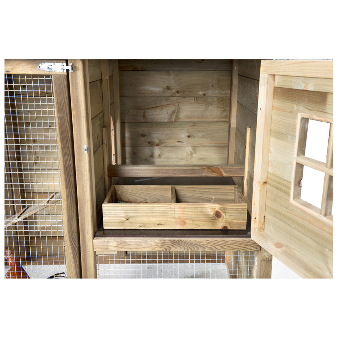 Het Voldux kippenhok Kiki biedt alles wat jouw kippen nodig hebben in één verblijf; een fijne overdekte scharrelruimte, een ruimtelijke nachthok met afsluitbare deur voorzien van een plexiglas ruitje én optimale bescherming bij verschillende weersinvloeden.