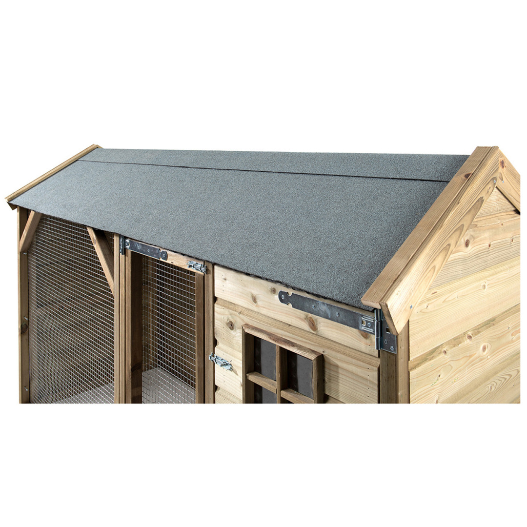 Doordat de kippenren overdekt is met een karakteristiek spits dak voorzien van dakleer kunnen jouw kippen zelfs op regenachtige dagen lekker buiten scharrelen. Naast comfort voor jouw kippen biedt dit hok ook voordelen voor jezelf. Het kippenhok is gemaakt van onderhoudsvrije materialen, hierdoor vraagt het hok geen jaarlijkse schuur en schilderbeurt en biedt deze minstens 10 – 15 jaar onderhoudsvrij plezier in de achtertuin.
