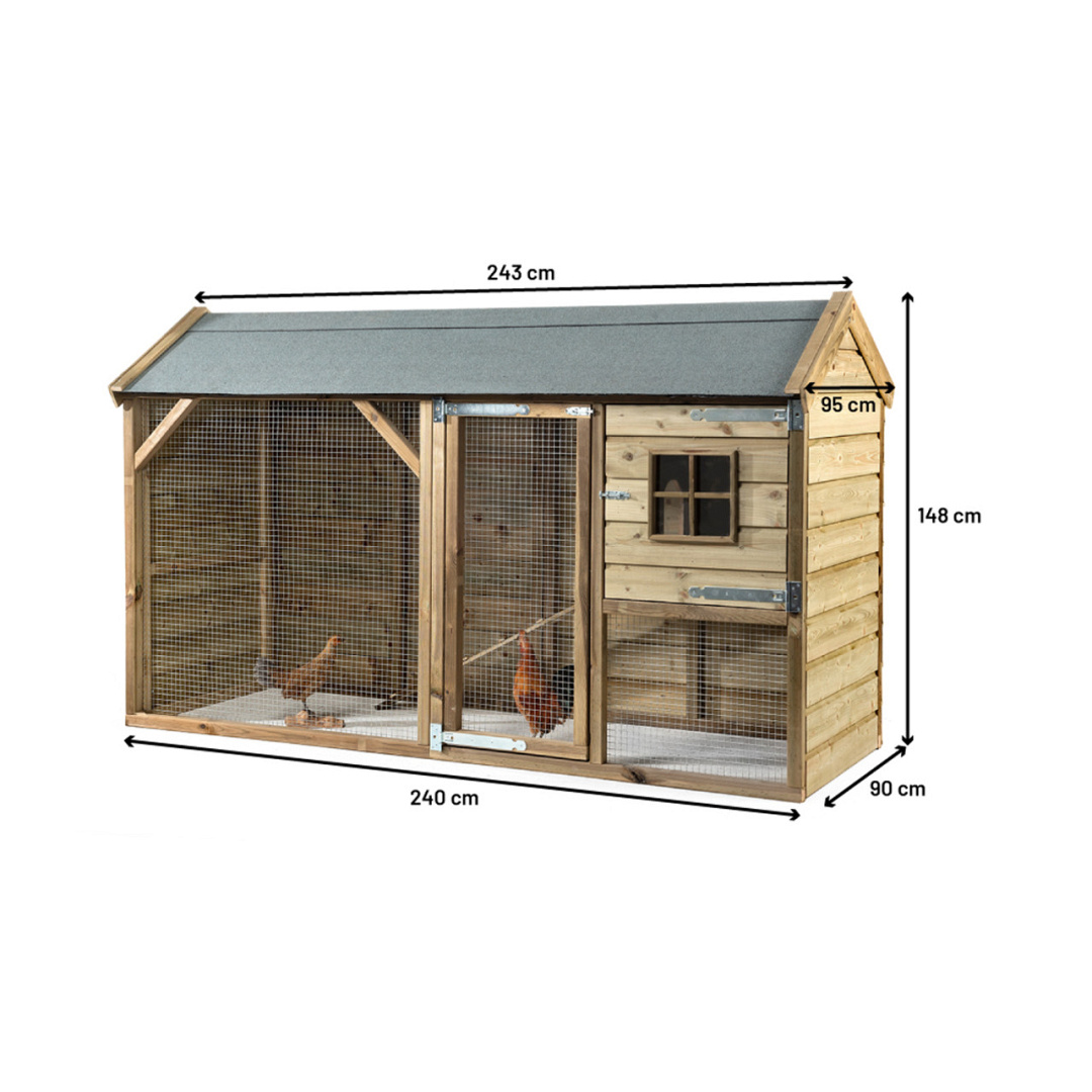 Het handgemaakte kippenhok Kiki wordt geleverd als voorbewerkt bouwpakket welke met de bijgeleverde montagehandleiding eenvoudig te monteren is. Het grote kippenhok heeft een totale scharreloppervlakte buitenmaat van (L) 240 x (B) 90 centimeter en een uiterste buitenmaat van (L) 243 x (B) 95 x (H) 124 centimeter, perfect voor het houden van meerdere kippen.