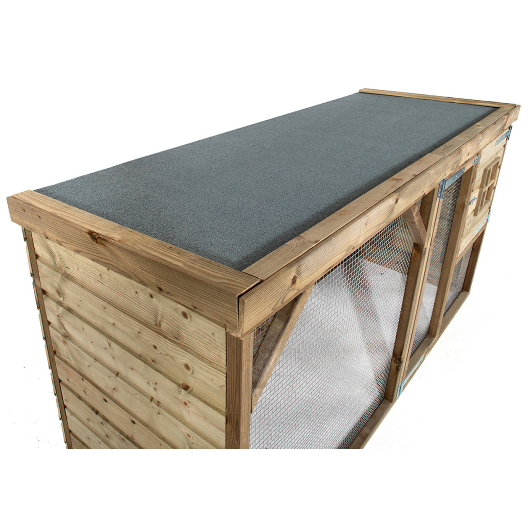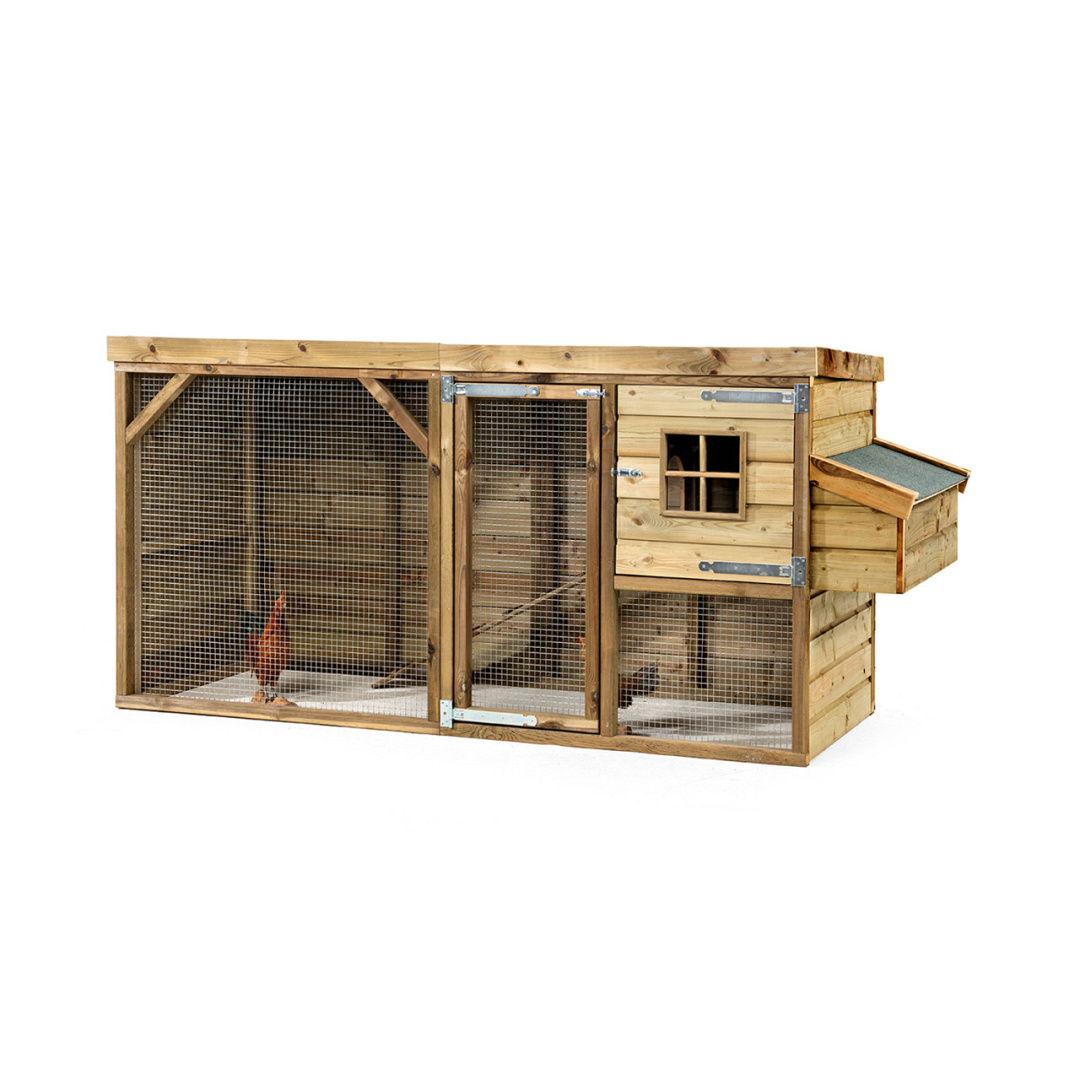 De kippenren beschikt over een toegangsdeurtje voor jezelf en een kippentrap die jouw kippen directe toegang bieden tot het nachthok. Dit nachthok, voorzien van een afsluitbaar toegangsdeurtje met plexiglas venster biedt stokruimte aan meerdere kippen. Aan het kippennachthok bevindt zich eveneens het legnest, deze is vanaf buiten het hok te openen door het afneembaar dakje.