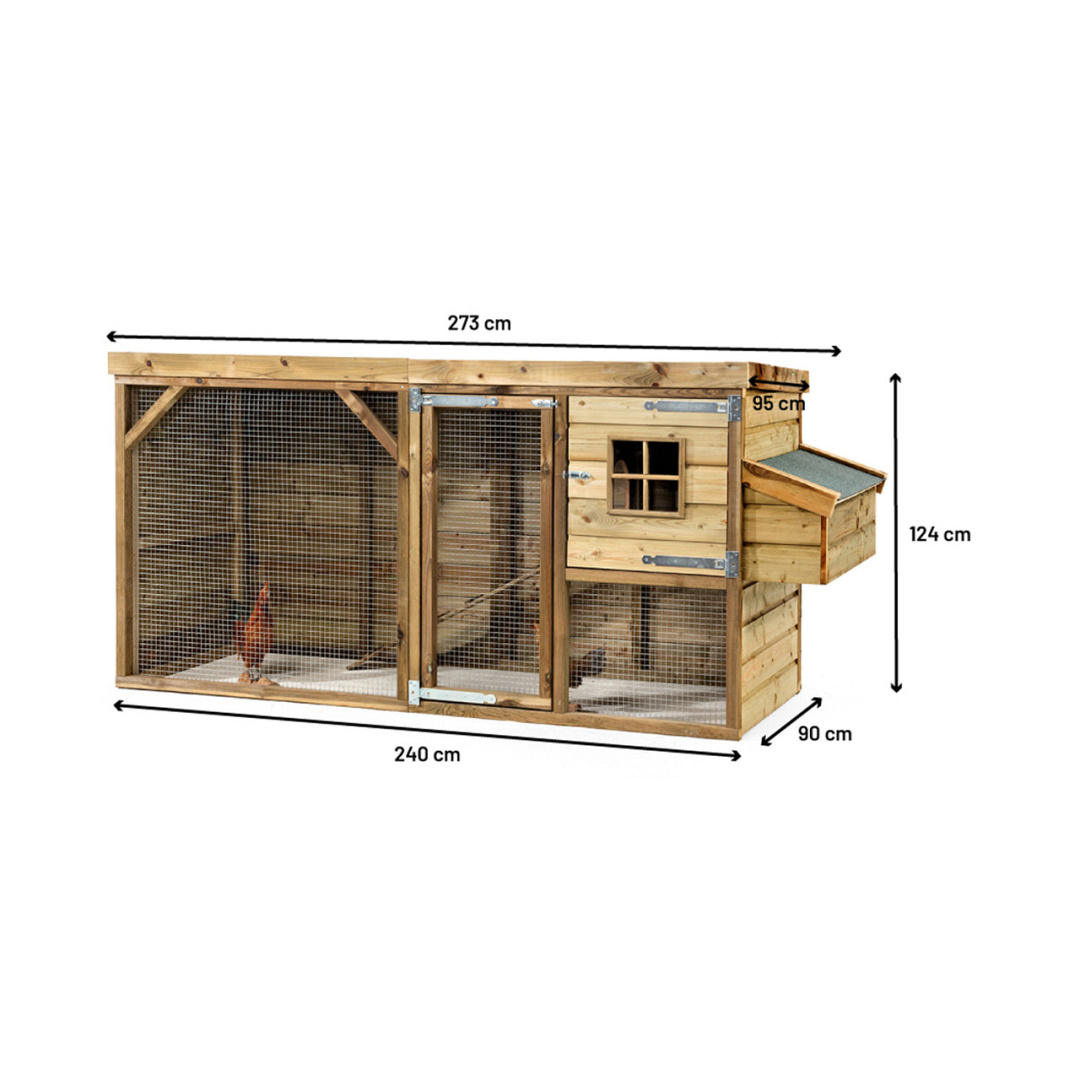 Het handgemaakte Voldux kippenhok Nelly heeft een grondoppervlakte van (L) 240 x (B) 90 centimeter buitenmaat en een totale buitenafmeting van (L) 243 x (B) 75 x (H) 124 centimeter, inclusief dak. Het gehele verblijf is voorzien van een schuin aflopend plat dak, afgewerkt met sterk dakleer voor een goede afwatering.