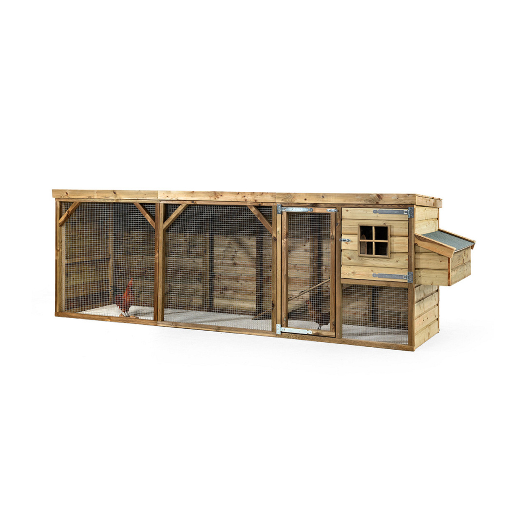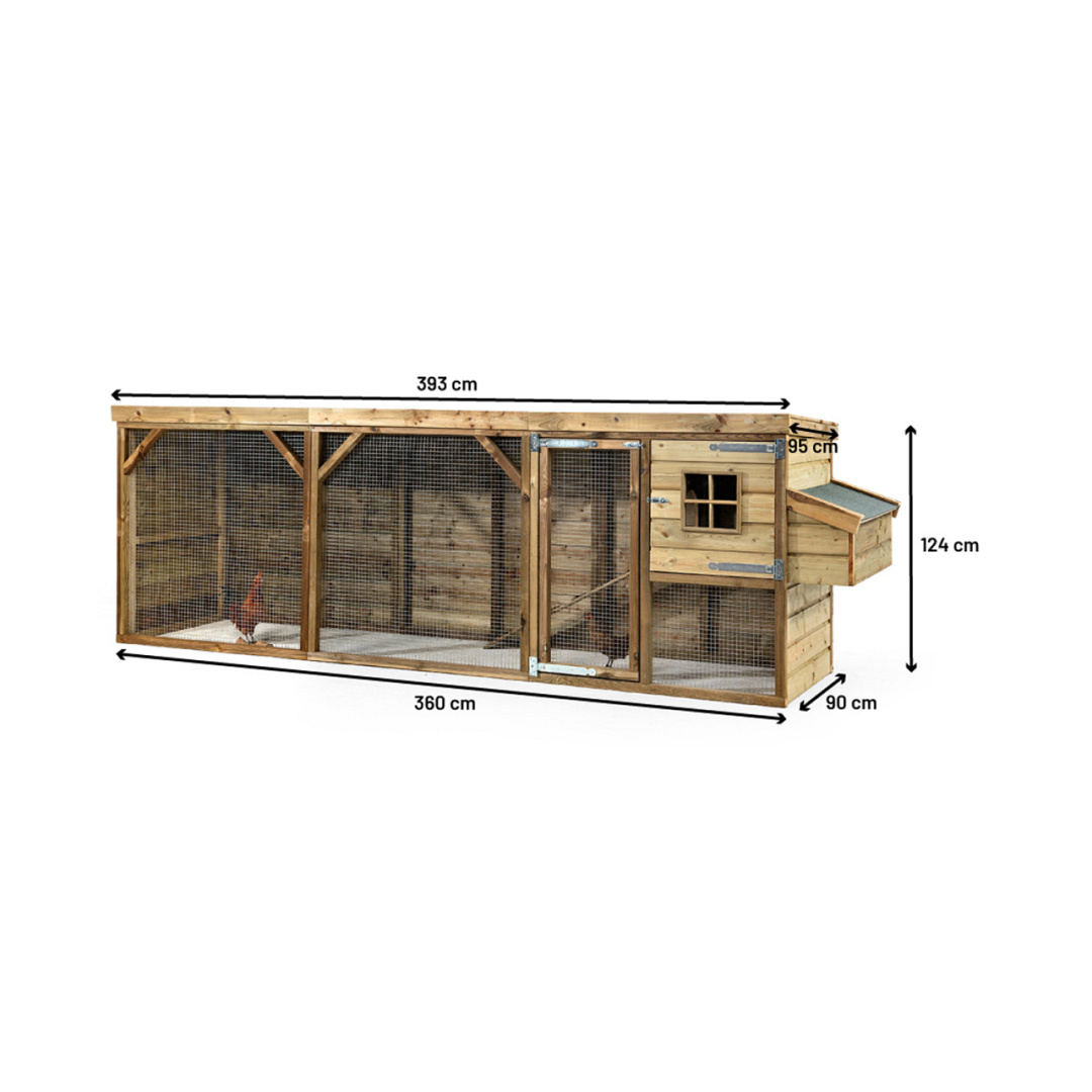 De kippenren beschikt over een deur aan de voorzijde, waarmee je altijd optimale toegang hebt tot het verblijf en jouw kippen. Het nachthok is te bereiken via het trapje welke voorzien is van griplatjes, zo scharrelen jouw kippen eenvoudig het nachthok in vanuit de ren. Dit nachthok is voorzien van een afsluitbare deur aan de voorzijde, het plexiglas venster geeft een goede inkijk in het hok. Aan de rechterzijde van het nachthok bevindt zich het externe legnest voorzien van een afneembaar dak. Hierdoor blijft er meer stokruimte over in het nachthok én kun je de kippeneitjes rapen zonder het volledig hok te hoeven openen.