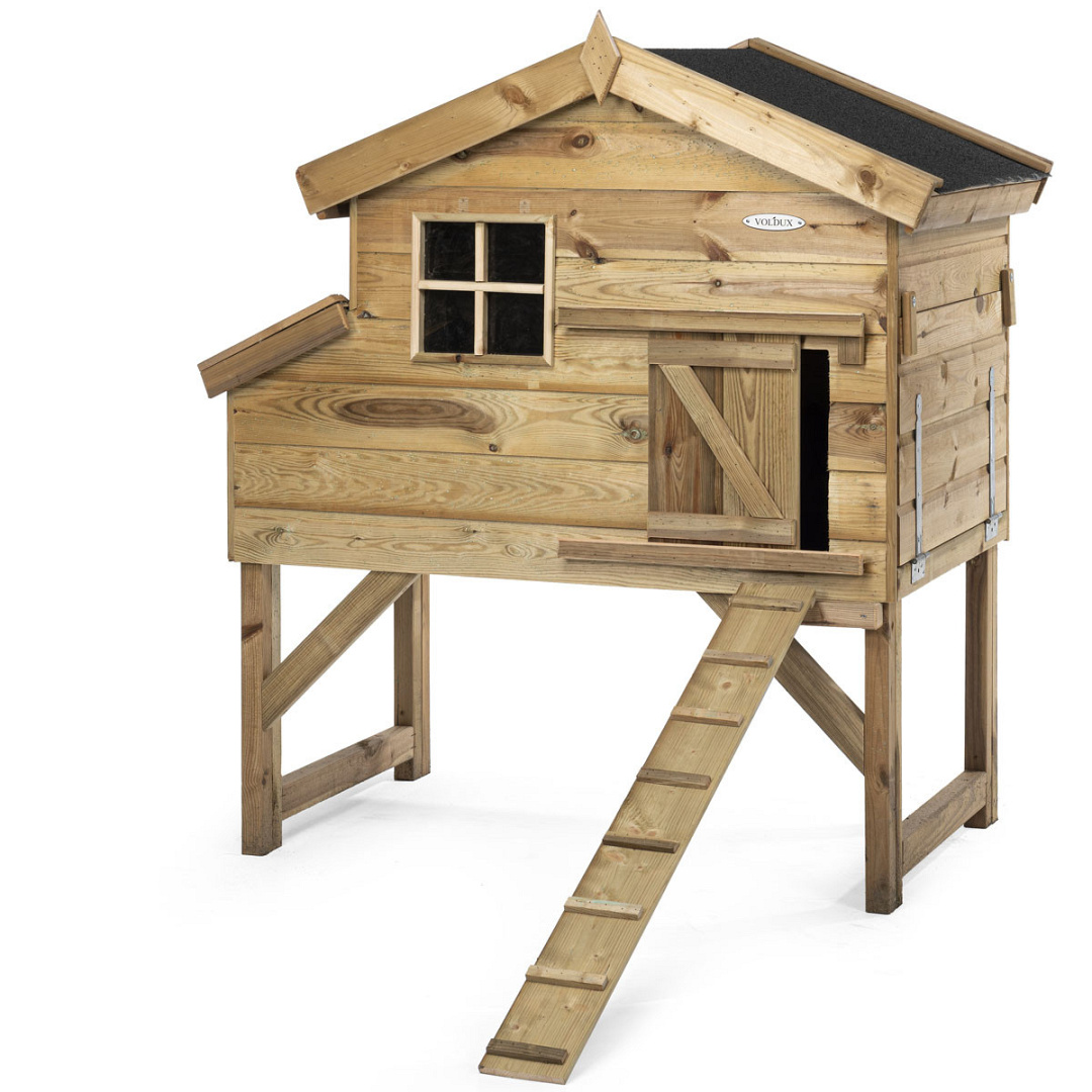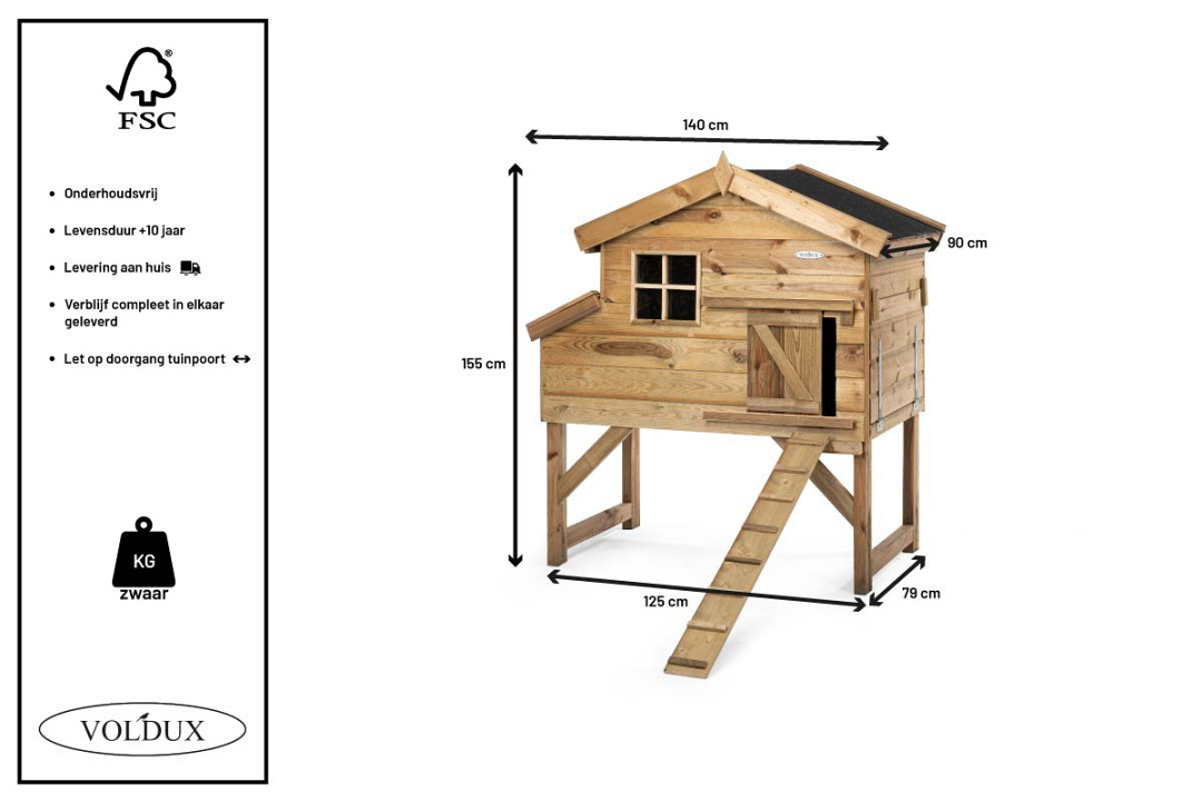 Het Voldux kippenhok Jasper wordt geproduceerd door gespecialiseerde vakmannen van Voldux die zorgen voor een perfect resultaat. Het verblijf wordt volledig gemaakt van geïmpregneerd hout. Dit maakt het hok onderhoudsvrij en zeer geschikt voor buiten.