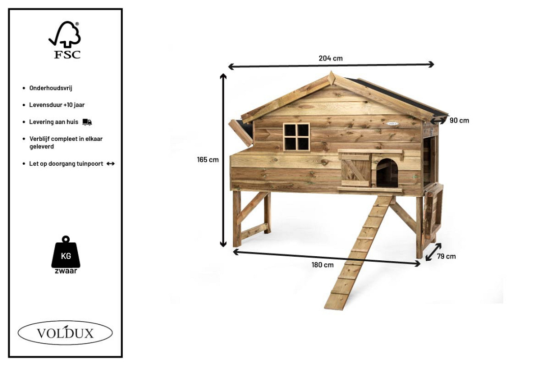 Voldux Kippenhok Jasper XL is volledig gemaakt van geimpregneerd hout. Dit maakt het hok onderhoudsvrij en zeer geschikt voor buiten. Het verblijf is van zeer hoge kwaliteit en heeft een garantie van 2 jaar.
