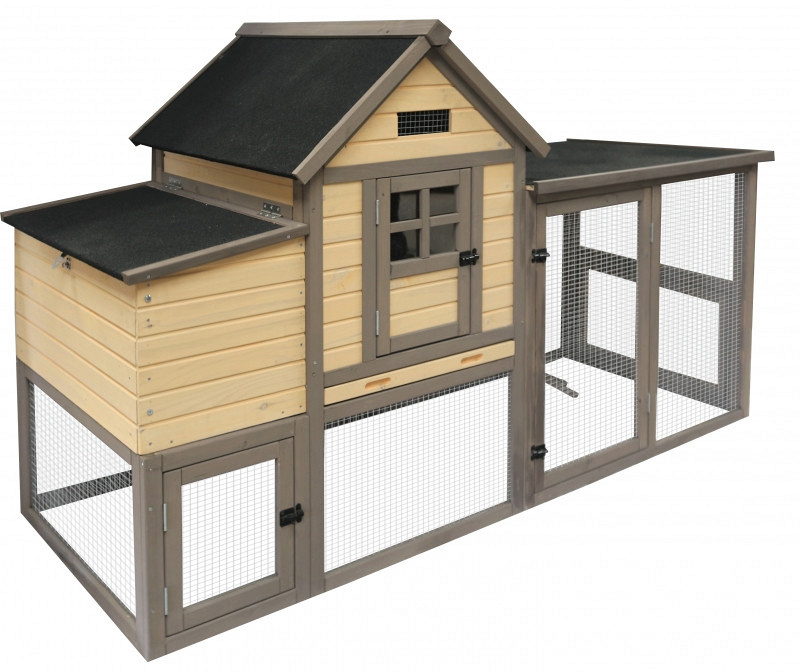 Het hok is geschikt voor zeven kippen en is voorzien van een schuiflade en vier deuren. Zo kun je gemakkelijk het hok reinigen en de kippen eten en drinken geven.