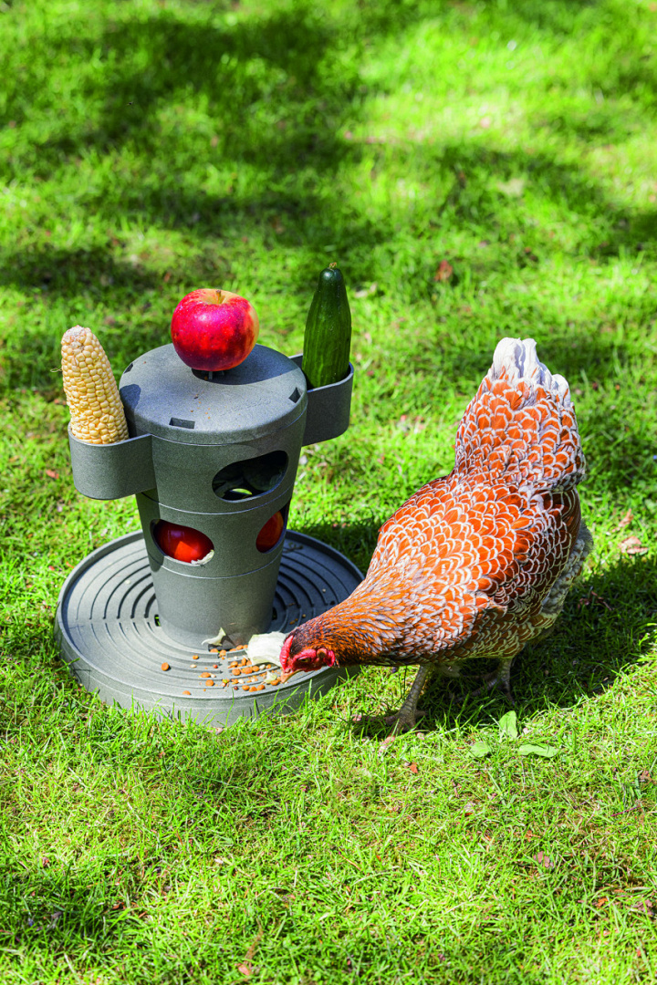 Leuke snacktoren van gerecycled plastic. Snacks en kippenvoer kunnen op verschillende plekken worden gestopt.