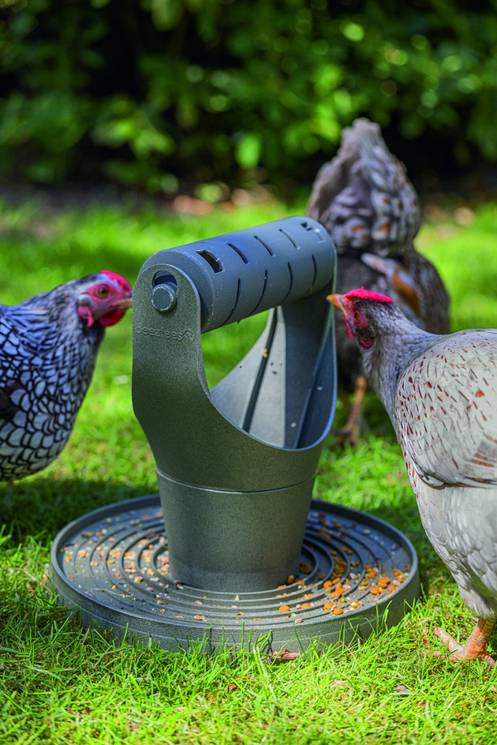 Leuke snacktoren van gerecycled plastic. Het voer kan uit de toren worden gepikt door je kip. Inclusief afwateringssysteem voor regenwater.