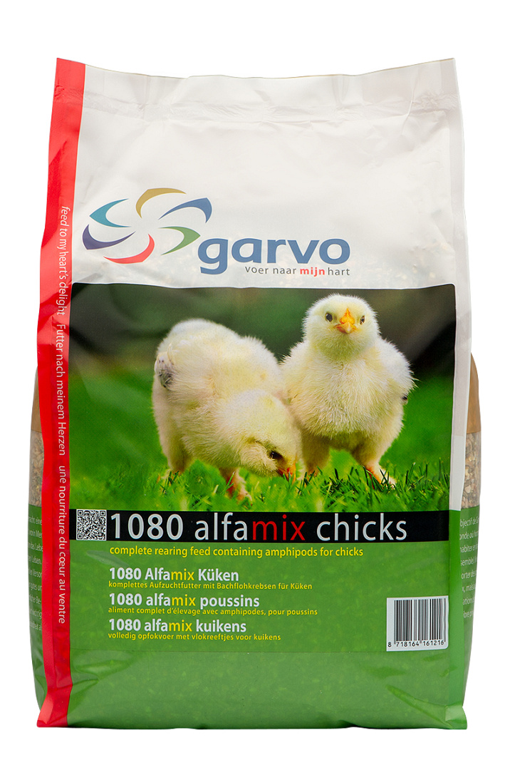 Garvo Alfamix kuikens is een volledige granenmengeling met korrels en vlokreeftjes voor jonge kippen vanaf 3 weken tot aan de leg.