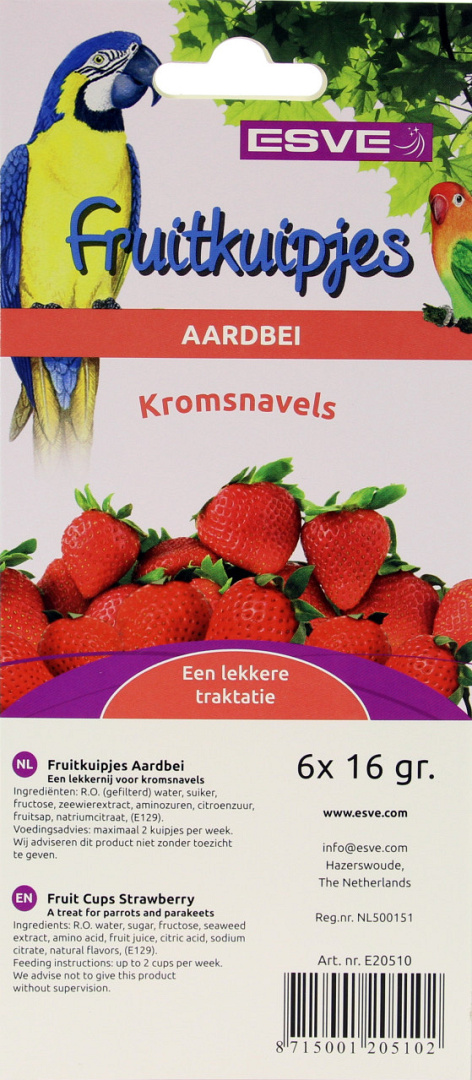 De ESVE fruitkuipjes zijn een lekkere traktatie voor jouw kromsnavel. ESVE fruitkuipjes kunnen uit de hand gegeven worden, uit de poot gegeten worden en in een houder aangeboden worden.