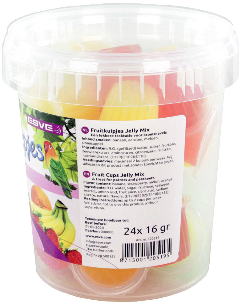 De Esve Fruitkuipjes Jelly zijn een lekkere traktatie voor jouw kromsnavel. ESVE fruitkuipjes kunnen uit de hand gegeven worden, uit de poot gegeten worden en in een houder aangeboden worden.