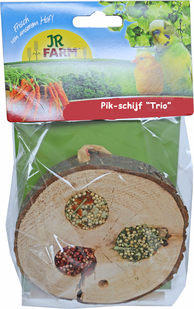 De JR Farm pikschijf Trio is een loofhouten schijf met een vulling van drie verschillende groenten en kruiden. Voorzien van een touwtje om hem in de kooi op te hangen.