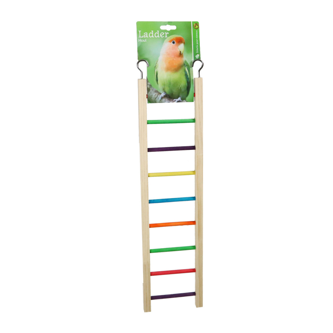 Deze 9-traps ladder met gekleurde treden is een vrolijke verschijning in ieder vogelverblijf. De ladder is voorzien van twee metalen ophanghaken waardoor deze gemakkelijk te plaatsen is in ieder verblijf.