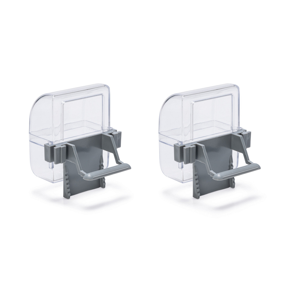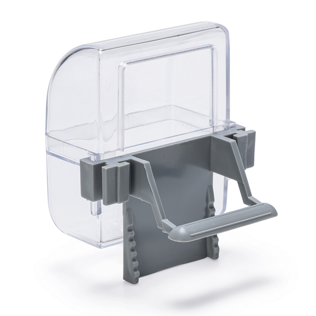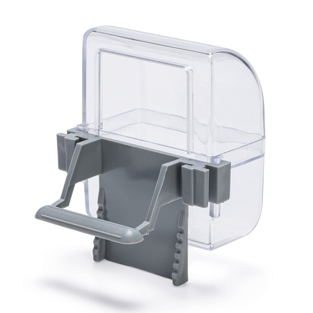 Transparante voer- en drinkbak. Gemakkelijk aan de vogelkooi te bevestigen.