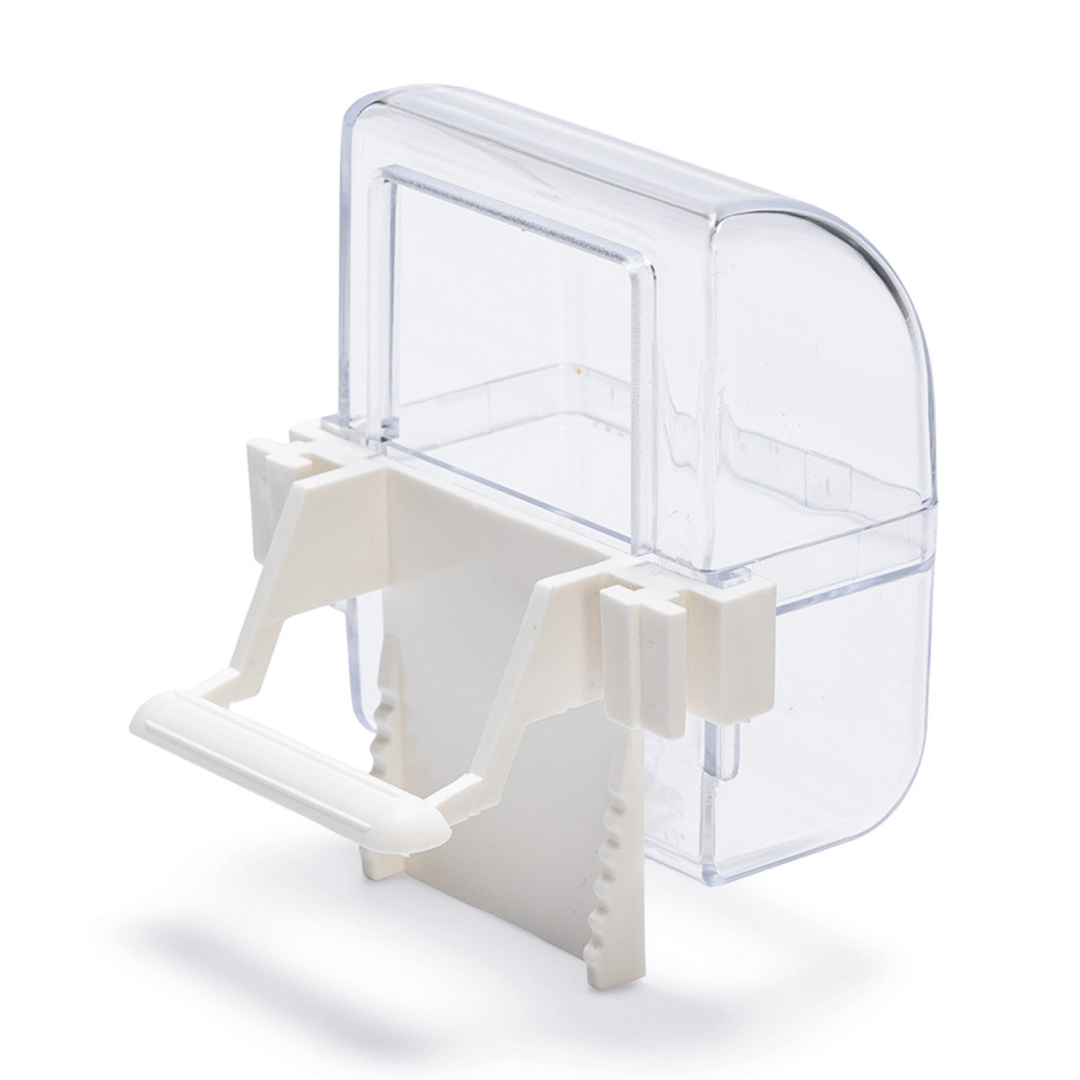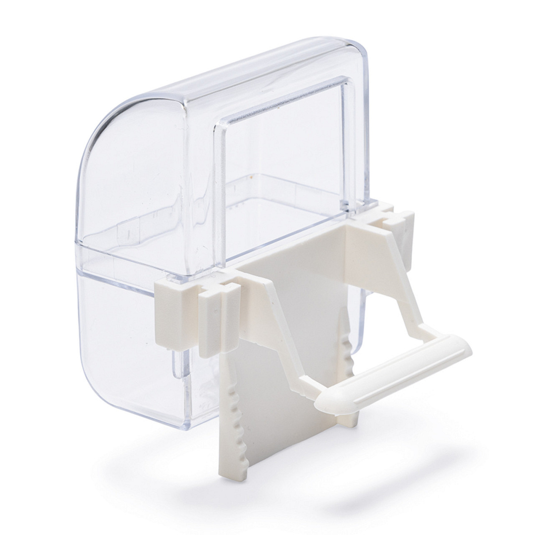 Transparante voer- en drinkbak. Gemakkelijk aan de vogelkooi te bevestigen.